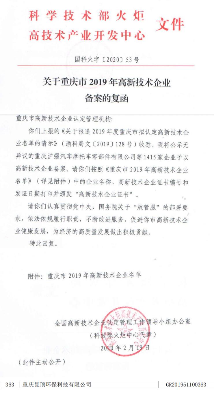經(jīng)重慶市科技局初審、國家科技部復(fù)審,并根據(jù)國家《高新技術(shù)企業(yè)認(rèn)定管理辦法》和《高新技術(shù)企業(yè)認(rèn)定管理工作指引》的相關(guān)規(guī)定,重慶昆頂環(huán)保科技有限公司被認(rèn)定為“國家級高新技術(shù)企業(yè)”(GR201951100363)。 國家高新技術(shù)企業(yè)是指在國家重點(diǎn)支持的高新技術(shù)領(lǐng)域內(nèi),持續(xù)進(jìn)行研究開發(fā)與技術(shù)成果轉(zhuǎn)化,形成企業(yè)核心自主知識產(chǎn)權(quán),并以此為基礎(chǔ)開展經(jīng)營活動的企業(yè),屬于國內(nèi)領(lǐng)先或國際先進(jìn)的企業(yè)。 “國家高新技術(shù)企業(yè)”認(rèn)定,是由國務(wù)院頒布的認(rèn)證資質(zhì)和條件,并由財(cái)政部、科技部、稅務(wù)總局聯(lián)合負(fù)責(zé)認(rèn)定管理工作。該資質(zhì)對于企業(yè)核心技術(shù)的自主知識產(chǎn)權(quán)數(shù)量、研發(fā)團(tuán)隊(duì)、銷售與總資產(chǎn)成長性、科技成果轉(zhuǎn)化力等各個方面都有極其嚴(yán)格的要求,我公司能最終獲得認(rèn)定,說明公司在新一代環(huán)保技術(shù)創(chuàng)新研發(fā)方面得到國家的大力支持和認(rèn)可,同時,積極推動了公司自主創(chuàng)新、自主研發(fā)的進(jìn)程。