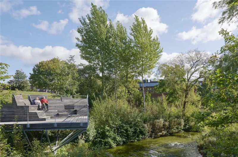 景觀(guān)設(shè)計(jì)的理念是讓人們以不同的方式去接近池塘陡峭的邊緣,這樣做的目的是在池塘周?chē)鷦?chuàng)造具有社會(huì)吸引力的場(chǎng)所和散步地。設(shè)計(jì)師建立了雙向設(shè)計(jì)原則,大池塘的西邊提供了可以駐足、坐下、觀(guān)景和約會(huì)的地方,這里的陽(yáng)光甲板和平臺(tái)位于水面之上,靠近邊緣。而東區(qū)則恰恰相反,那里有一條蜿蜒的長(zhǎng)廊,包含著一些較小的社交空間,沿著落差上下排布的樓梯在局部區(qū)域是一直延伸到水面的。