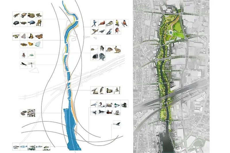 該方案在一個(gè)泛濫平原理念的基礎(chǔ)上設(shè)計(jì),當(dāng)水位低時(shí),人們能夠在寬闊的河岸沿線(xiàn)親近水、享受休閑活動(dòng),而在暴雨時(shí)期,河流附近的公園綠地成為一條運(yùn)輸線(xiàn)路,運(yùn)送下游的水流,在公園內(nèi)進(jìn)行多種土地利用,為公共活動(dòng)建造出更多的空間。